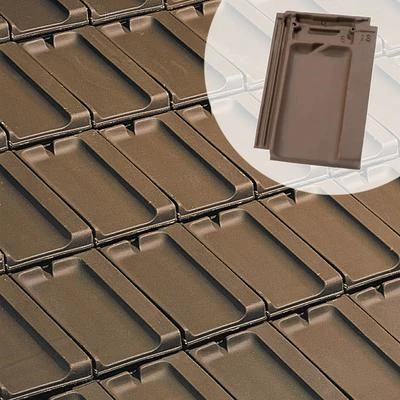 Tuile en terre cuite, à petit moule et à côte latérale à double emboîtement et double recouvrement. Elle se pose à joints droits.