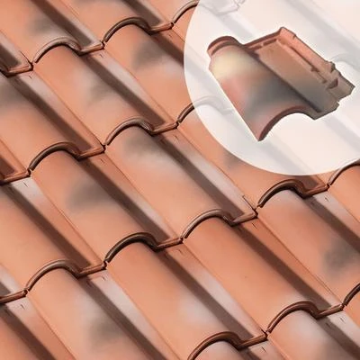 Tuile de terre cuite à emboîtement à relief, double emboîtement, double recouvrement pour toitures à faible pente.